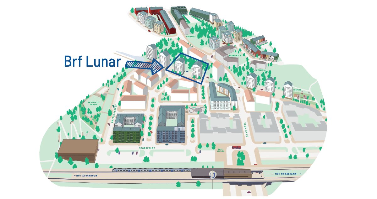 Brf Lunar består av 83 ljusa och öppna lägenheter i den växande stadsdelen Vega, 20 min från Stockholms innerstad. Här har du närhet till både natur, service och den nya pendeltågsstationen.